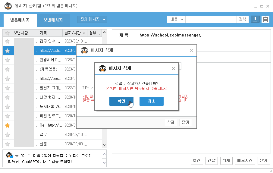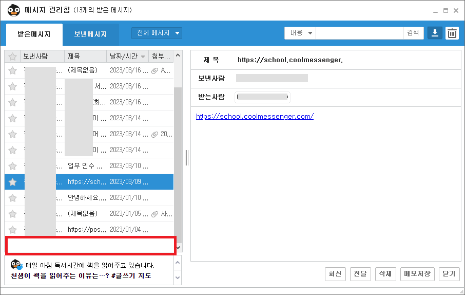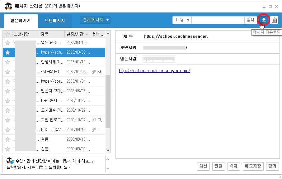 (사용자 자리에 저장되어있는 쿨메신저 메시지 관리함 원본 자체를 백업하고자 하는 경우 '메시지 보관함 백업 안내 FAQ' 링크를 참고해 주시기 바랍니다.)