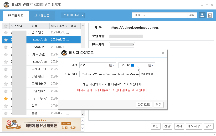 (설정 기간이 길거나 많은 양의 메시지를 다운로드 하는 경우 처리 시간이 길어질 수 있습니다.)