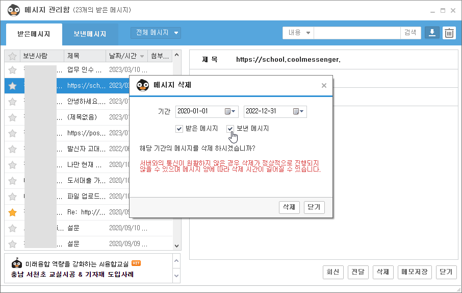 2. 삭제 원하는 기간을 지정하고 삭제 영역(받은 메시지 | 보낸 메시지) 체크한 후 [삭제]를 클릭합니다.